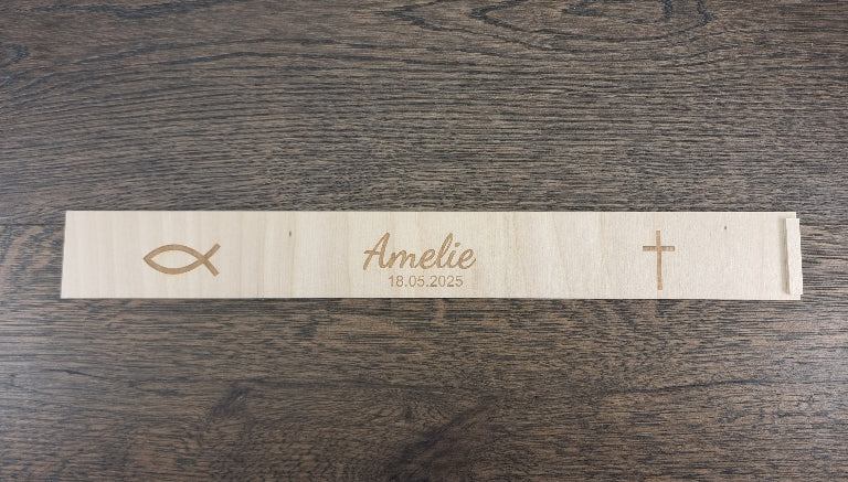 Diese elegante und schöne Holzkiste (45 x 4,8 x 4,8 cm) dient als perfekte Aufbewahrung für die Taufkerzen unserer Liebsten. Hergestellt in Österreich, kann sie individuell mit Name und Taufdatum beschriftet werden. Auch mit Symbolen deiner Wahl erhältlich und optional mit Holzwolle Füllung (2€).