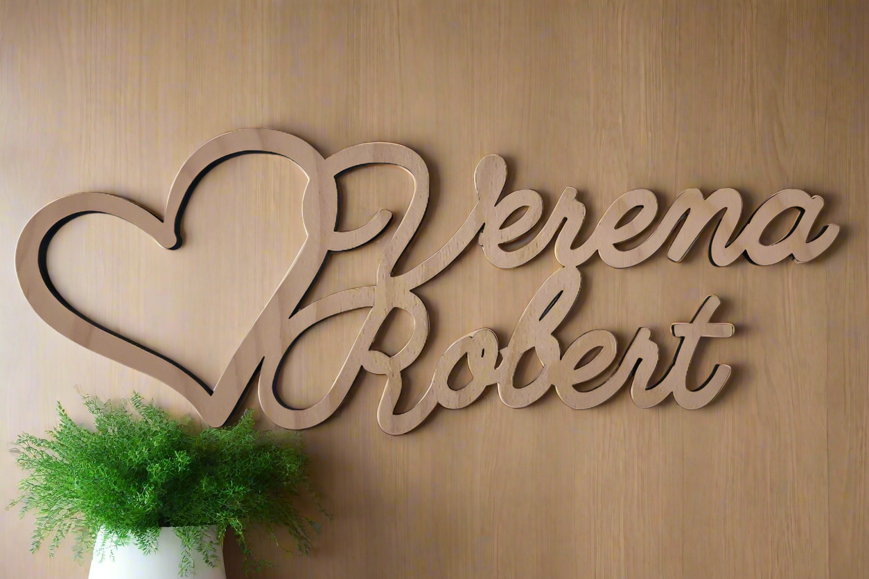 Personalisierte Wanddeko Herz mit individuellen Namen – ein echter Blickfang in A4, A3 oder A2 Format. Aus hochwertigem 8mm österreichischem Sperrholz gefertigt. Perfekt für bis zu 5 Namen, wobei wir ab 3 Namen die größere A3-Variante empfehlen. Einfach deine Wunschnamen in der gewünschten Reihenfolge in den Bestellnotizen vermerken und ein einzigartiges Dekorationsstück für dein Zuhause erhalten.